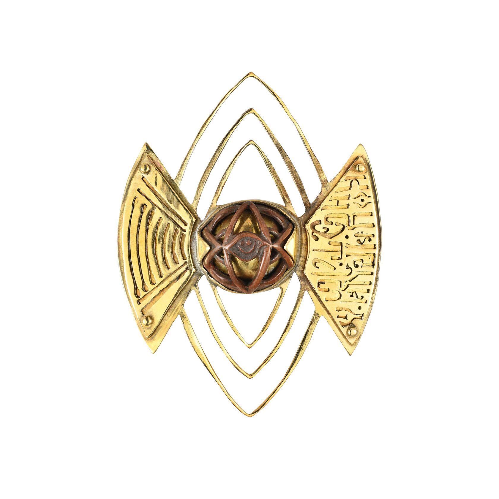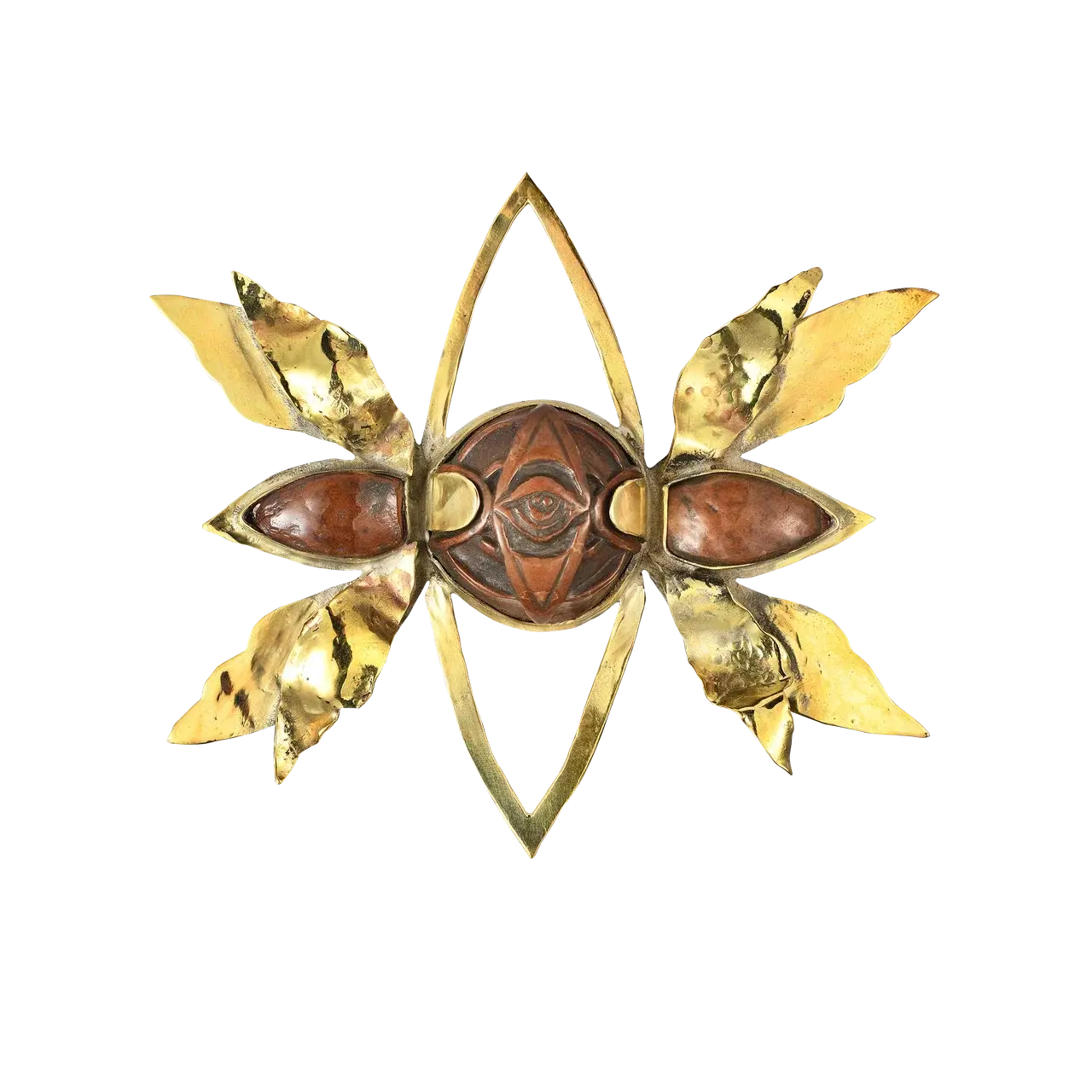 The brooch "Concentration". Materials: brass, gold plating, macadamia nut